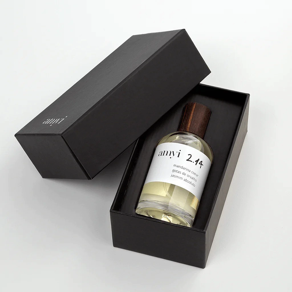 O perfume Amyi 2.14, criado pelo perfumista Leandro Petit, é uma ode ao equilíbrio da alma inspirado no movimento gracioso de uma gota de orvalho sobre uma folha. A fragrância proporciona uma experiência sensorial tridimensional, como se fosse possível visualizar e tocar a gota de orvalho pelo olfato. A combinação de notas cítricas de mandarina coeur e laranja amarga oferece uma sensação refrescante duradoura.