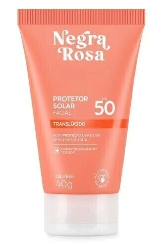 O Protetor Solar Facial Translúcido FPS 50 Negra Rosa possui inovadora textura em gel translúcido que não deixa resíduos brancos na pele.