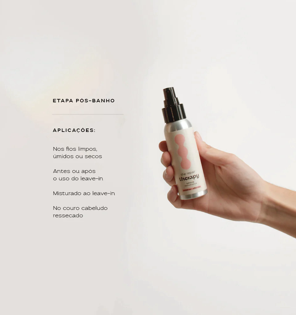 A elevada concentração de proteínas e aminoácidos vegetais biofuncionais do sérum The Repair Therapy preenche, restaura e fortalece a fibra capilar, para cabelos mais resistentes, macios e brilhantes.